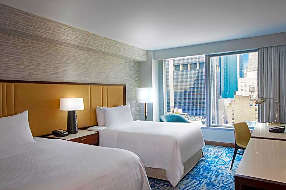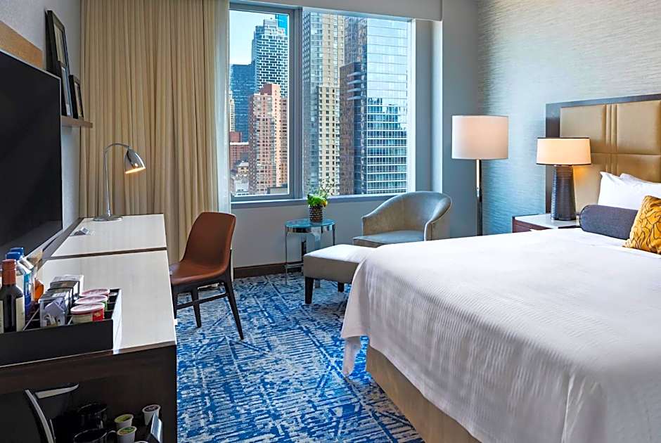 Featuring large windows with views of New York City, this room has a 42-inch flat-screen TV and a private bathroom with a spacious walk-in shower.